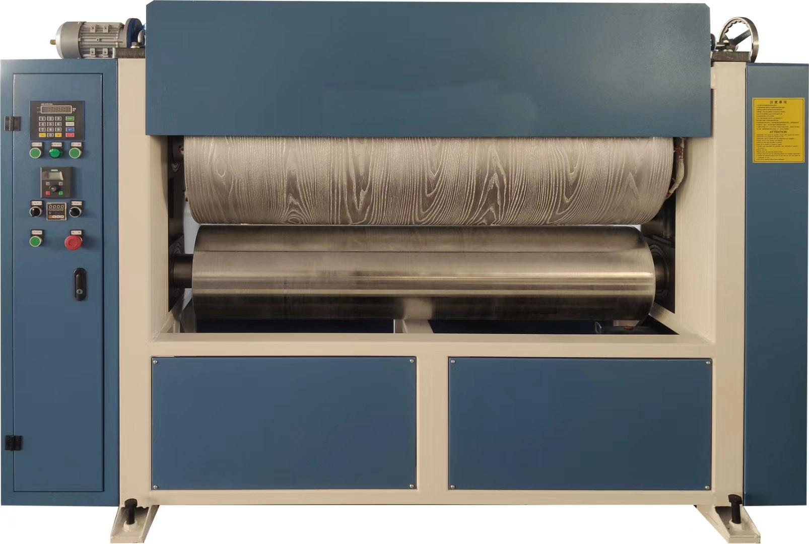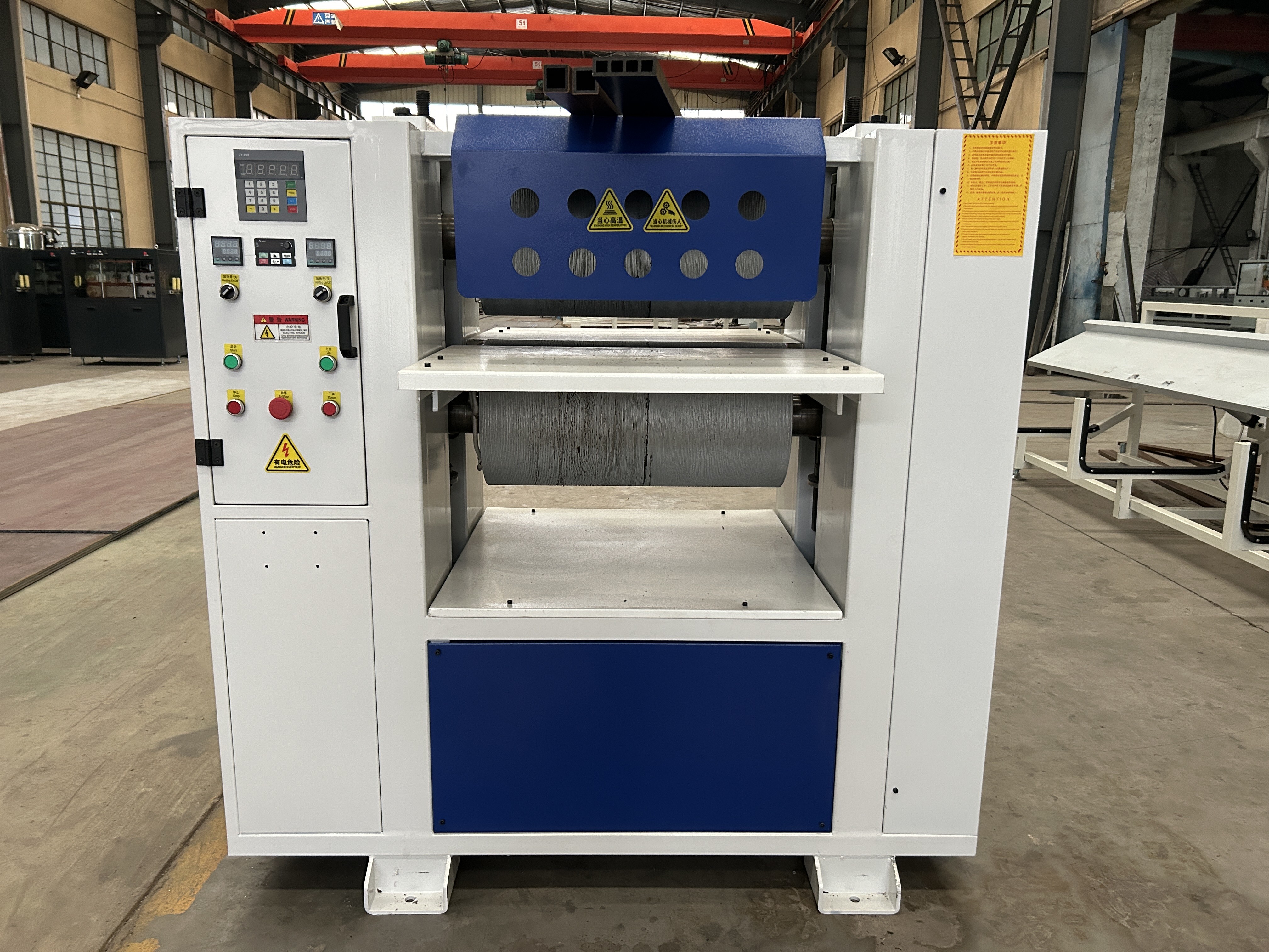 La máquina es adecuada para paneles de PVC, PE, PP y otros paneles de WPC, bambú, paneles compuestos, paneles de madera, paneles de fibra, paneles de espuma y otras placas de relieve decorativas para exteriores e interiores,con una longitud de más de 20 mm,, se obtiene tridimensional, aumentar la belleza, mejorar la calidad del producto. Está compuesto por el marco de la máquina, el dispositivo de calefacción superior y inferior, el controlador de temperatura, el rodillo de relieve superior y inferior,caja de control, motor de reducción de las ruedas cicloides, sistema hidráulico.