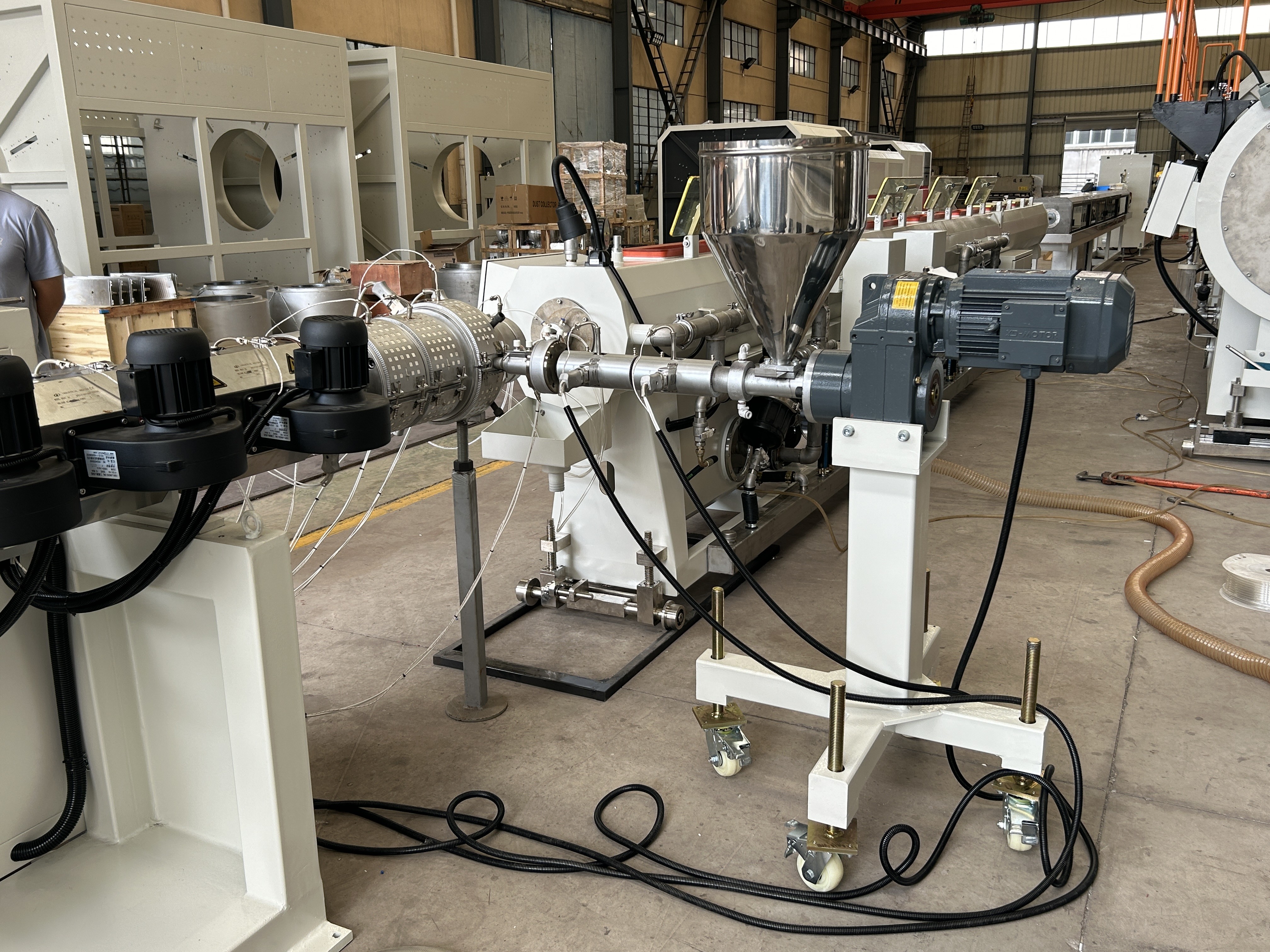 La extrusora de un solo tornillo funde y homogeneiza el material de PE, luego lo empuja a través de una cabeza de matriz de tubería para formar una forma de tubería continua. Las zonas de temperatura se controlan con precisión para una fusión óptima.