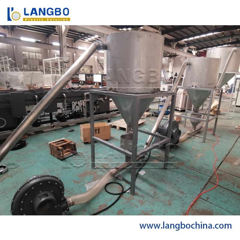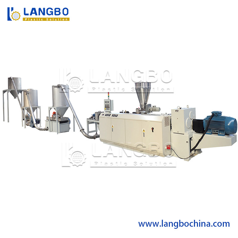 Raw material+ additive → Mixing → Conveying feeding → hopper feeding → Conical twin screw extruder → Hot face cutting → Cyclone separator → Vibration sieve → Blowing system → Storage hopper → Finished product packing